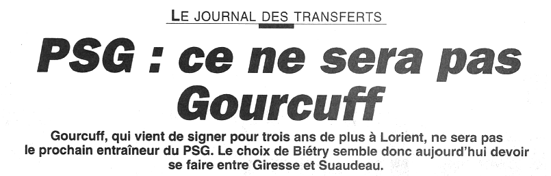 Le profil de l’entraîneur de Lorient intéresse le nouveau président – breton -du PSG, qui n’en fait pourtant pas son premier choix. Mais les refus de Muller, Suaudeau et Sacchi ramènent Gourcuff au poste de favori avec Troussier comme concurrent principal. Un rencontre entre Gourcuff et Bietry aurait même été organisée à Paris après le match de championnat entre le PSG et Monaco, le 25 avril 1998. Trois jours plus tard, Troussier précise qu’il ne devrait pas être le futur entraîneur parisien : « C’est Gourcuff, à 90% » déclare alors le sélectionneur de l’Afrique du Sud. Tout semble joué.