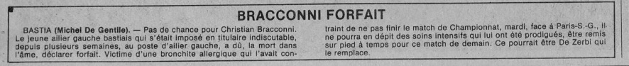 Le 4 mai 1982 à Furiani, Bracconi est cette fois titulaire, pour un match où les Bastiais doivent s’imposer pour rester parmi l’élite. A 21 ans, cet espoir du football corse semble promis à un bel avenir et vient d’être titularisé à plusieurs reprises, alors que Bastia est toujours en course pour conserver « sa » Coupe de France remportée un an plus tôt en finale contre Saint-Etienne (2-1, le 13 juin 1981).