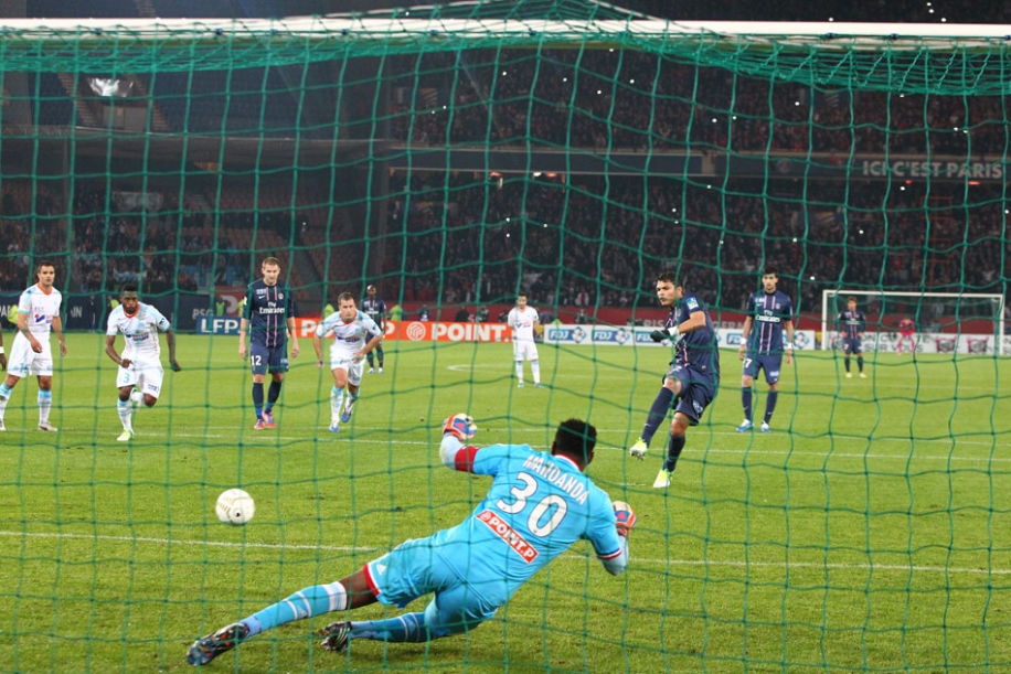 Mathieu Valbuena est tout proche d’ouvrir la marque sur une bonne frappe (21) avant que ne survienne le tournant du match. Guillaume Hoarau est retenu par Rod Fanni à l’entrée de la surface en position de dernier défenseur, offrant un penalty au PSG et laissant l’OM à dix (26). Le capitaine Thiago Silva trompe Steve Mandanda pour l’ouverture du score (28). Le match prend alors une tout autre tournure et Paris s’en remet à un Javier Pastore des grands soirs. Marseille n’abdique pas, à l’image de cette frappe tendue de Cheyrou peu avant la pause (43).