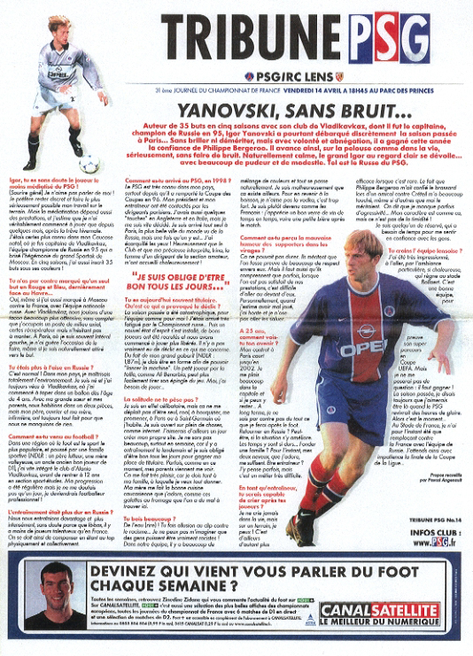 Le PSG doit s’imposer pour garder le contact avec le haut du classement, avec une éventuelle qualification pour la Ligue des Champions à la clé. Après des tentatives de Christian (14eme), Jay-Jay Okocha (15eme), Laurent Leroy ouvre logiquement le score en reprenant à bout portant un centre de Laurent Robert (33eme). Un avantage de courte durée : l’ancien parisien Bruno Rodriguez, parti à la limite du hors-jeu, remet les deux équipes à égalité (38eme). Le PSG reprend sa domination et sur un corner rapidement joué par Ali Benarbia, Robert frappe au but et marque d’une frappe croisée (44eme). Paris va se mettre rapidement à l’abri après la pause : sur une action à une touche de balle entre Leroy, Benarbia et Christian, Leroy frappe dans l’axe et trompe le gardien lensois, GuillaumeWarmuz (49eme). La réaction des Nordistes est timide, Bernard Lama est intraitable sur une tête de Rodriguez (62eme). Benarbia se procure une occasion d’aggraver le score, sans succès (74eme) mais se rattrape en fin de rencontre en déposant le ballon sur la tête de Leroy, qui inscrit son troisième but de la soirée et réussit le premier triplé de sa carrière (84eme). Paris s’impose avec la manière, Philippe Bergeroo est ravi : « Au delà des trois points, ce qui me satisfait le plus et que nous avons réalisé un match de haut niveau. Le retour de la paire Okocha-Benarbia nous a apporté beaucoup de technicité ».