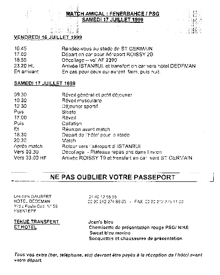 En ce début de saison 1999-2000, le PSG vient de débuter ses matches de préparation en s’imposant face au Servette Genève à Vittel sur le score de 3-1. Paris doit jouer son prochain match en Turquie face à Fenerbahçe, dans le cadre du transfert de Jay-Jay Okocha un an plus tôt vers Paris.